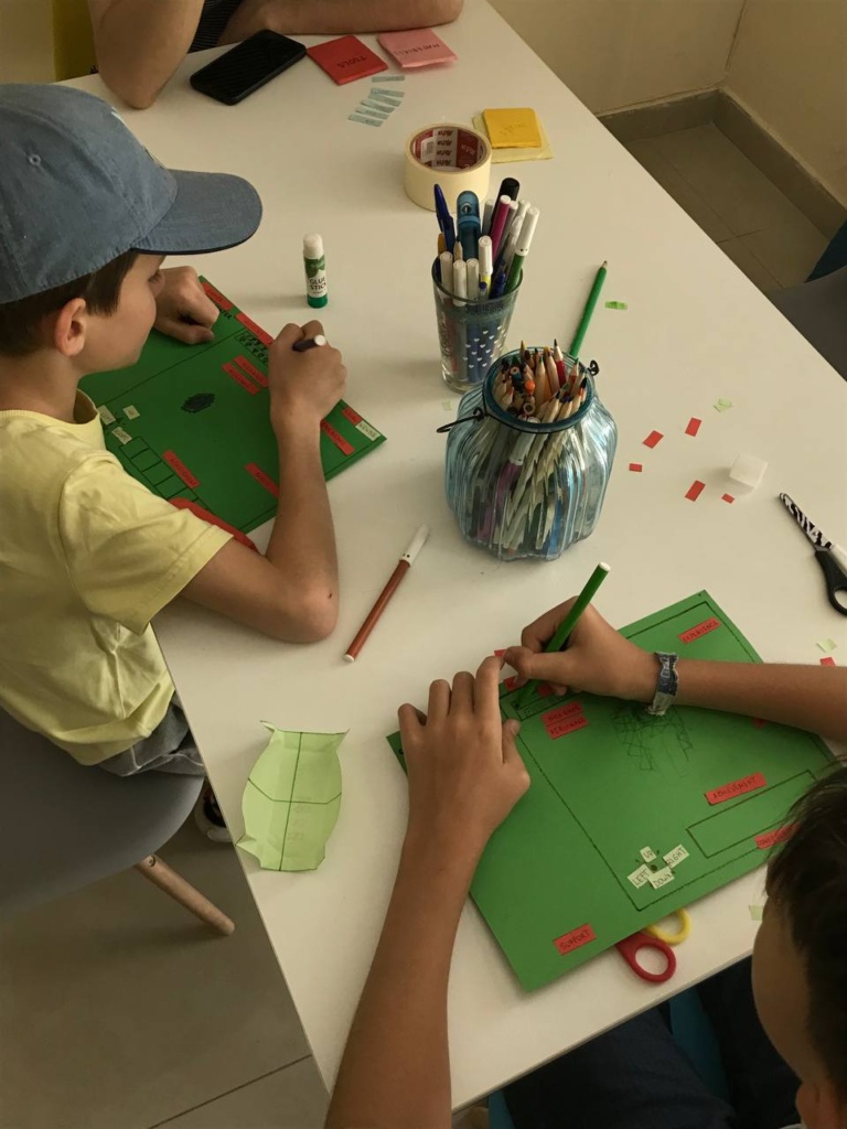 Грузинские буквы и слова записаны в тетради, превращены в украшение дневников. Английский язык превратился в инструмент с помощью компьютерных персонажей, которые оживали на картоне, приобретая новые качества и знания.